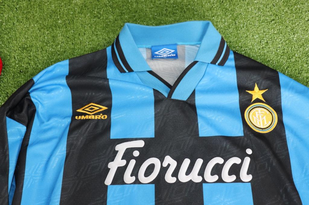 Prodotta da Umbro, presenta il tradizionale design a righe verticali nerazzurre con sponsor commerciale Fiorucci floccato al centro. Lo stemma del club è cucito sul petto, mentre il logo Umbro è ricamato. Questa stagione vide l’Inter consolidare il proprio organico in ambito nazionale ed europeo.