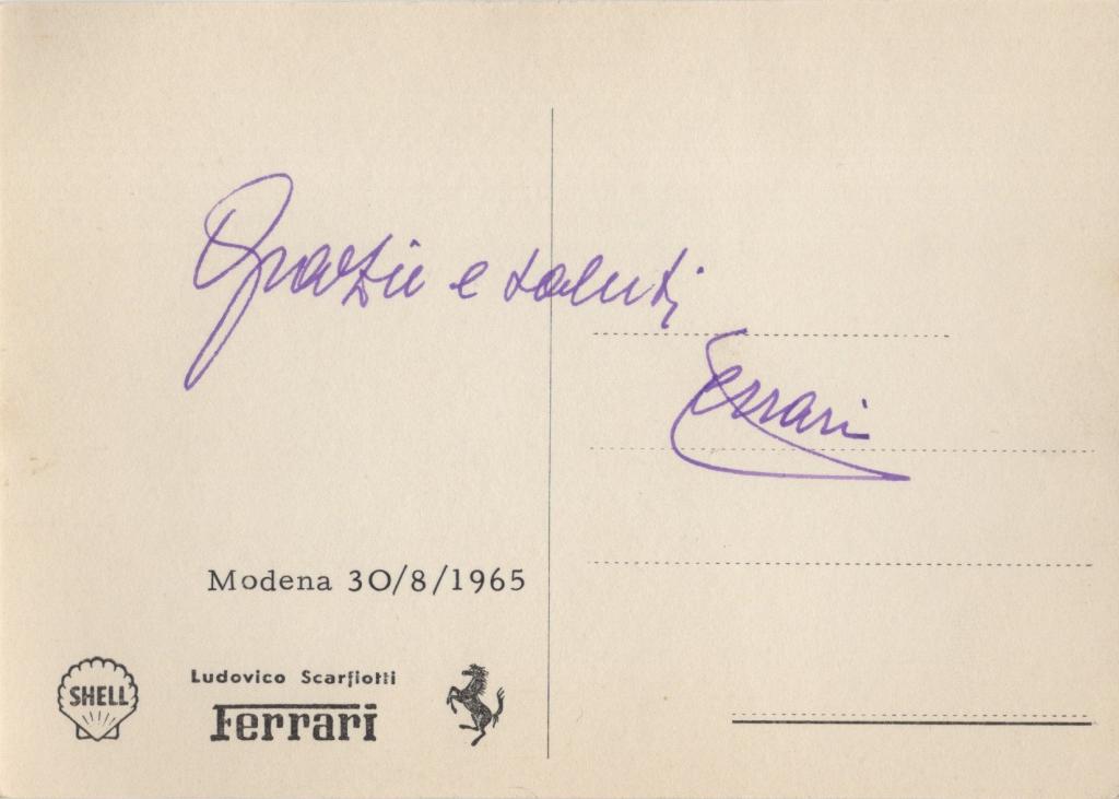 Autografo di Enzo Ferrari 1965 su cartolina Ludovico Scarfiotti
