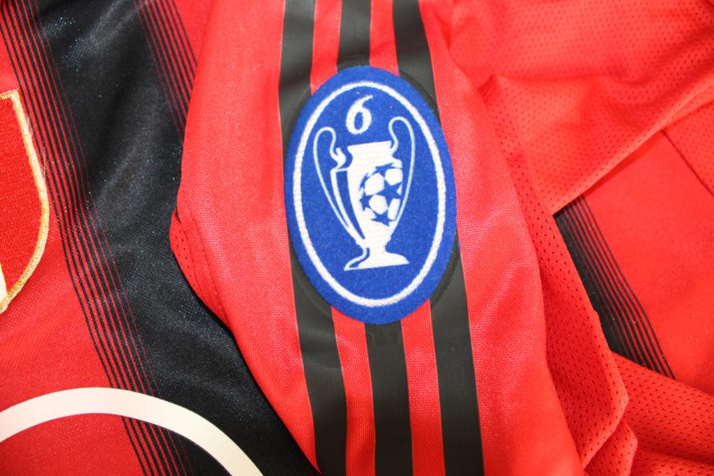 Sponsor Opel applicato a centro addome e stemma del club cucito. Il retro riporta il nome “SHEVCHENKO” e il numero 7, in stile ufficiale della stagione. La divisa riporta anche le patch della Lega Calcio Serie A sulla manica destra e quella delle 6 coppe di Champions League.