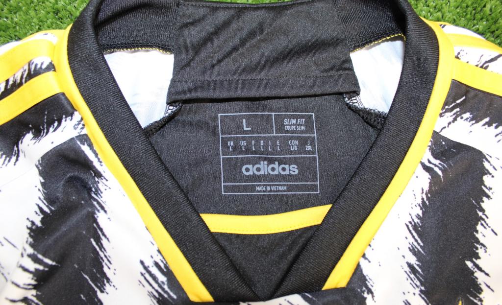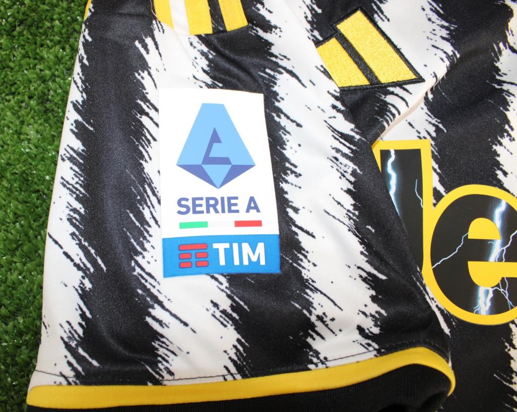 Sul petto sono presenti il logo Adidas, lo stemma del club e lo sponsor Jeep. Patch ufficiale della Serie A applicata sulla manica destra. Sul retro il nome e numero 9 di Dušan Vlahovic, attaccante serbo classe 2000 e punto di riferimento dell’attacco juventino.