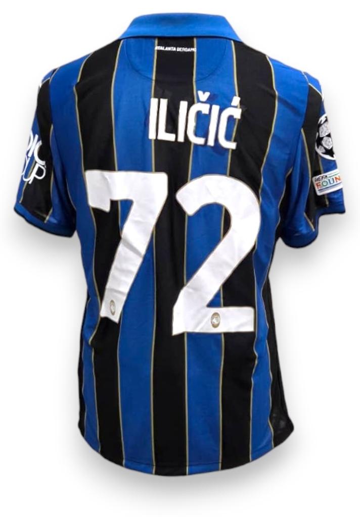 Maglia Atalanta home 2021/22 versione store con personalizzazione Ilicic 72 . Il fronte presenta le classiche strisce verticali nero-azzurre arricchite da sottili filetti dorati tra di esse, tipici del modello Joma di quell'anno.