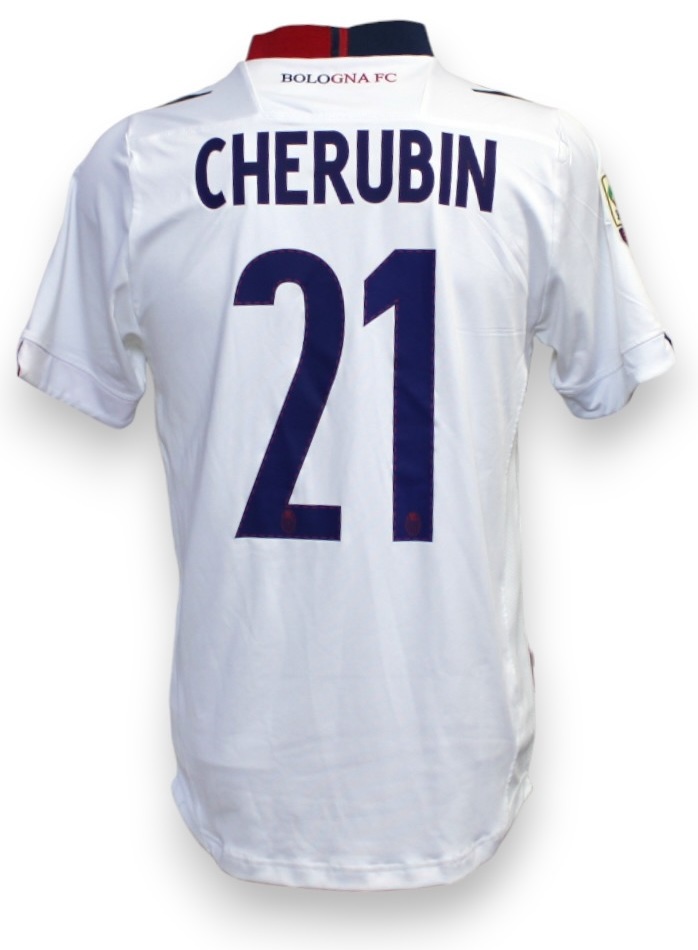Maglia away 2013/14 Bologna FC 1909, modello ufficiale Macron, player issued personalizzata con Cherubin 21 sul retro. Il design è prevalentemente bianco, e presenta una banda diagonale rossoblù che attraversa il lato sinistro del petto, un layout tipico delle divise da trasferta del Bologna nelle stagioni celebrative. Sull’etichetta interna al colletto è riportata la dicitura “50° Anniversario”, sulla manica è applicata la patch ufficiale della Serie A.
