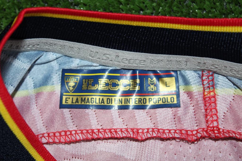 Maglia home del Lecce 2024/25, con stampa frontale “BetItaly Pay” sopra “DEGHI”. Player Issued con personalizzazione A. Rebic con il numero 3 in grande. Il colletto è a V con profilo scuro, e le maniche mostrano dettagli tonali che richiamano i colori sociali. L’interno del colletto ha un’etichetta con la dicitura “è la maglia di un intero popolo”, sulla manica è applicata la patch ufficiale di Serie A.