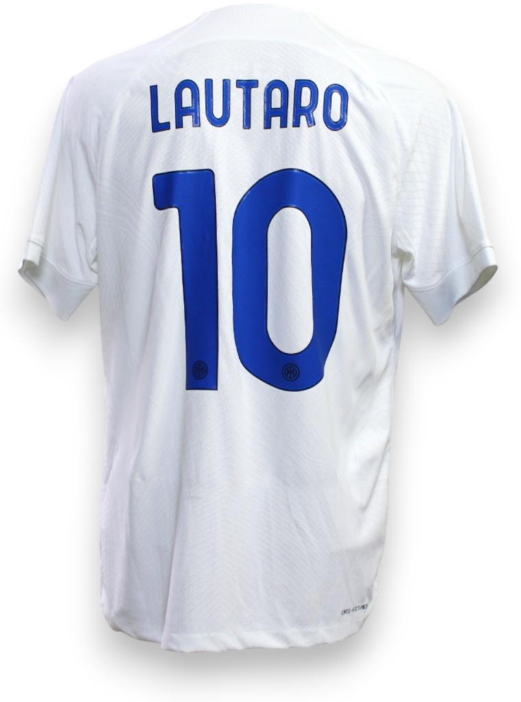 Maglia Inter Away stagione 2023/24, bianca con personalizzazione Lautaro 10 sul retro. Maglia versione store.