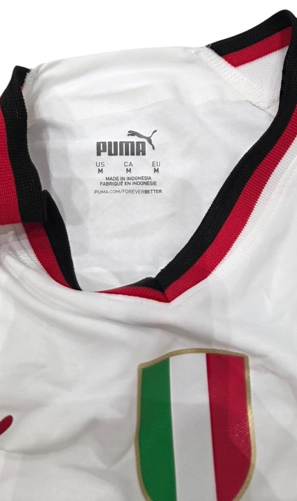La maglia Away del Milan 2022/23 prodotta da Puma si distingue per il design elegante in bianco con dettagli rossoneri e una serie di sottili righe orizzontali rosse sul fronte, che richiamano la tradizione grafica del club. Sul petto trovano posto lo Scudetto tricolore, simbolo del titolo conquistato nella stagione precedente, lo stemma societario con stella celebrativa e lo sponsor tecnico Puma, mentre al centro campeggia la sponsorizzazione “Emirates Fly Better”. Sul retro compare la personalizzazione ufficiale Messias Jr 30, completata in basso dal secondo sponsor “Wefox”. La patch ufficiale della Serie A è applicata sulla manica.