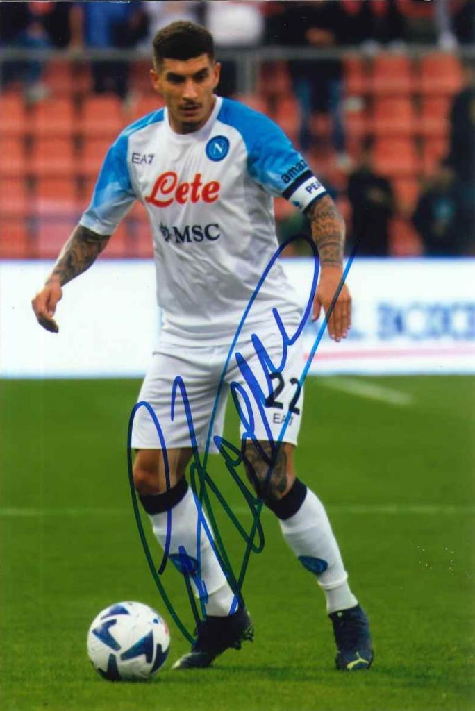 Autografo di Giovanni Di Lorenzo in azione con il Napoli, firma blu ben visibile sulla divisa bianco-azzurra.