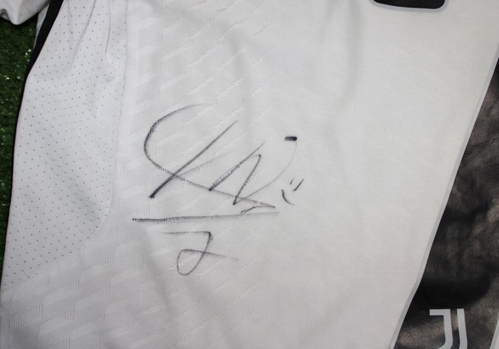 Il retro è personalizzato con il nome Chiesa e il numero 7, su cui spicca l’autografo originale del calciatore. La taglia in lettere (M) certifica la natura Store, differente dalla versione destinata ai calciatori professionisti. Realizzata in tessuto tecnico con tecnologia AEROREADY, questa divisa unisce innovazione e stile moderno, diventando un pezzo autentico da collezione grazie alla firma del campione bianconero.
