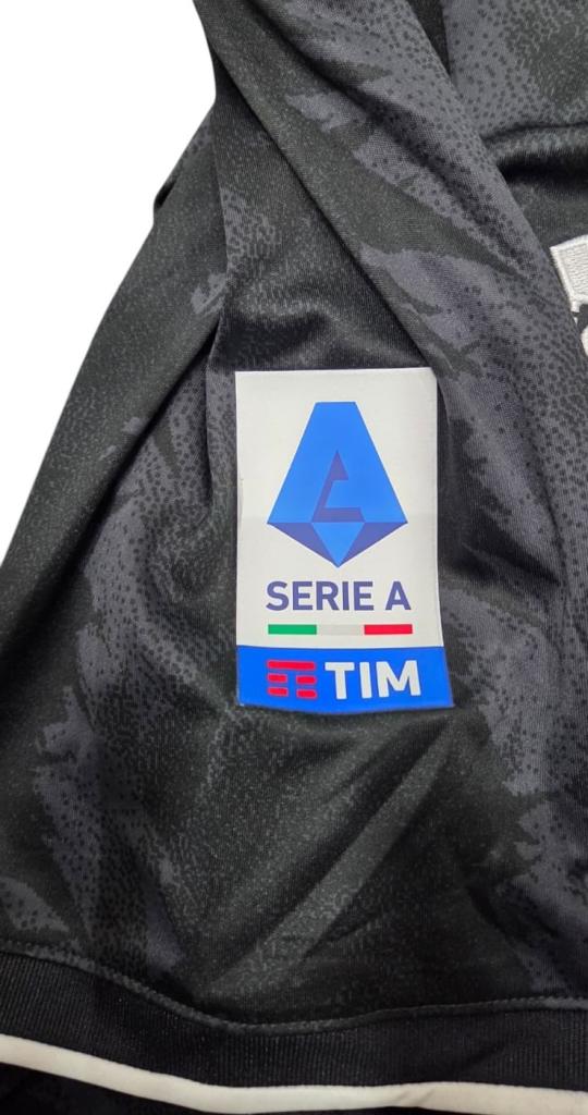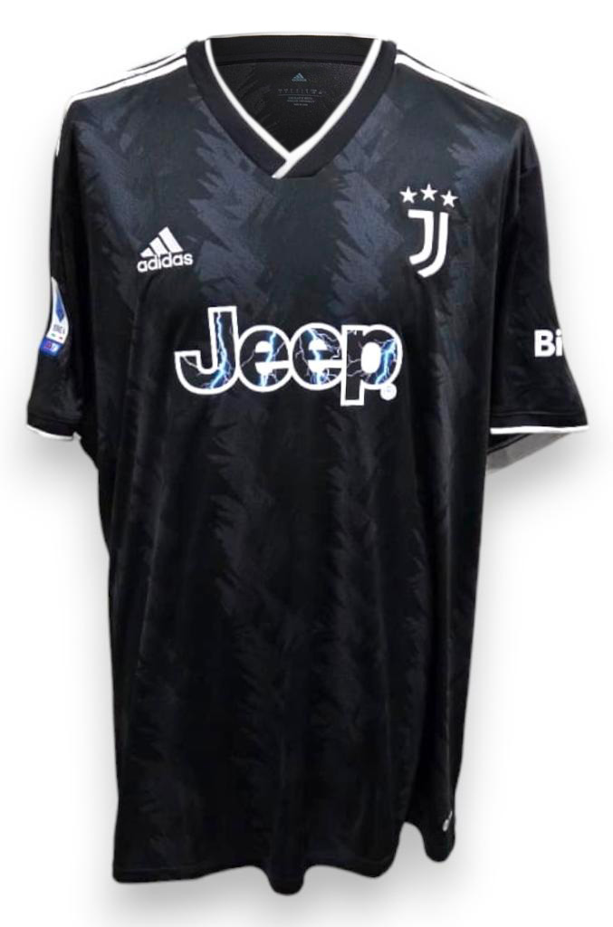 Maglia Juventus away della stagione 2022/23, realizzata da Adidas, versione store. La divisa si presenta in nero con dettagli tono su tono caratterizzati da una texture grafica a freccia, completata da inserti bianchi sullo stemma Adidas e sul nuovo logo Juventus a tre stelle. Lo sponsor principale Jeep compare in stampa centrale con effetto luminoso, accompagnato dallo sponsor secondario Cygames sul retro. Sulle maniche è applicata la patch ufficiale Serie A TIM.