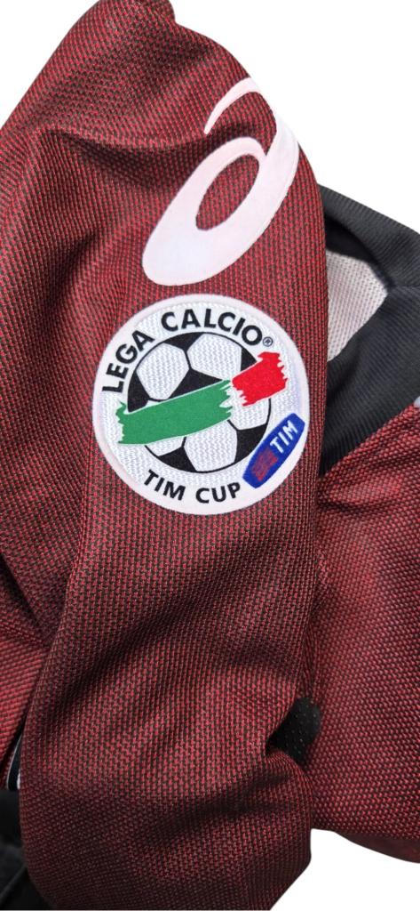 Maglia da portiere dell’Atalanta utilizzata nella stagione 2002/03, caratterizzata da una livrea granata con dettagli neri su fianchi e maniche, abbinata al colletto alto elasticizzato che conferisce un aspetto tecnico e solido. Realizzata da Asics, presenta lo stemma della Dea cucito al centro del petto e lo sponsor tecnico bianco ricamato, accompagnato dal main sponsor Promatech serigrafato in grande evidenza con inserti tricolore e blu. Sul braccio campeggia la patch ufficiale della Coppa Italia TIM, competizione a cui il club prese parte in quell’annata.