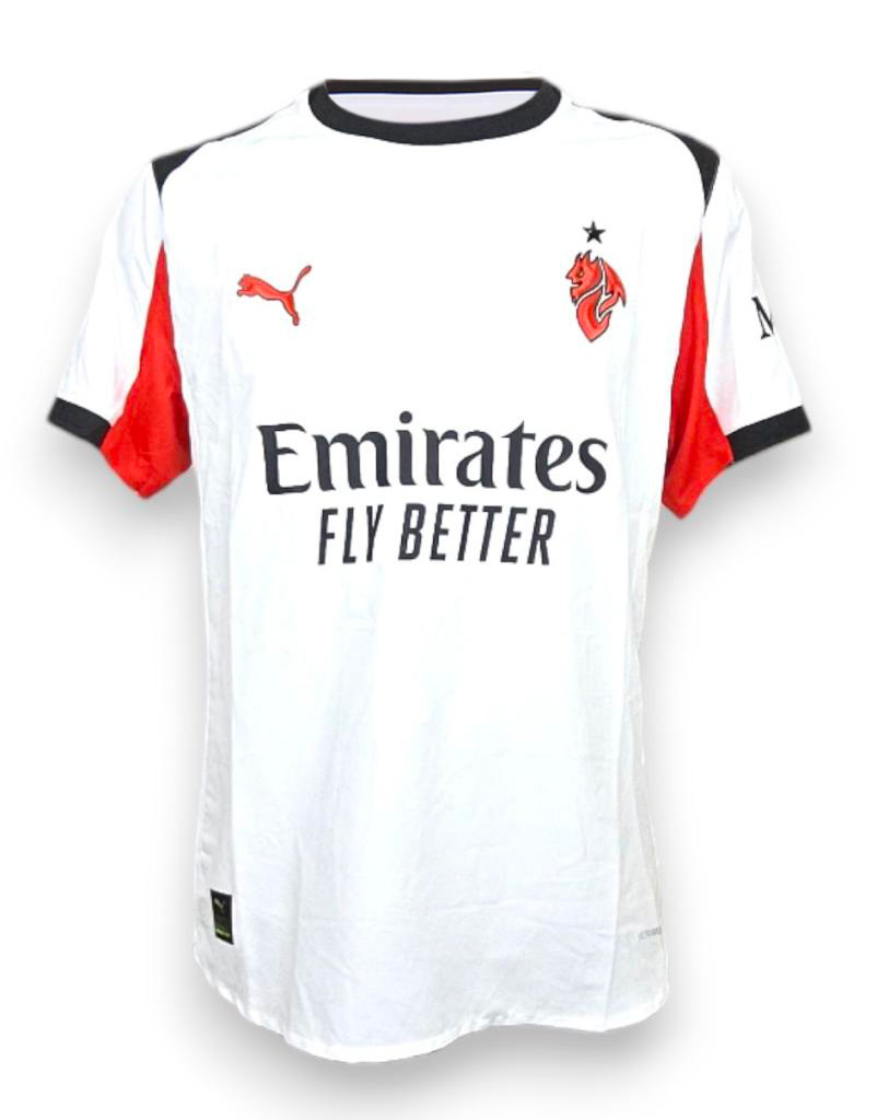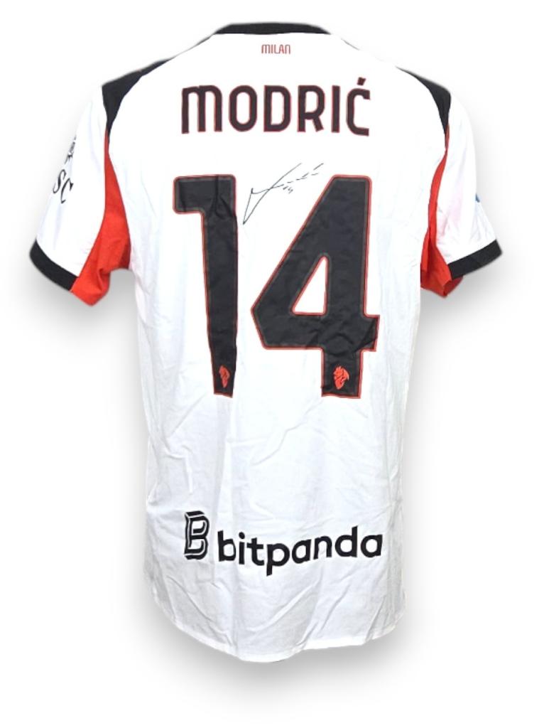 Maglia away Authentic store del Milan stagione 2025-2026, con autografo di Luka Modric, prodotta da Puma con base bianca e inserti neri e rossi. Il fronte presenta logo Puma, crest a diavolo sul petto e main sponsor Emirates Fly Better. Sulla manica destra figurano patch ufficiale Serie A e sponsor MSC, mentre sul retro sono applicati back sponsor Bitpanda e nameset ufficiale Modric 14 con firma sul retro.