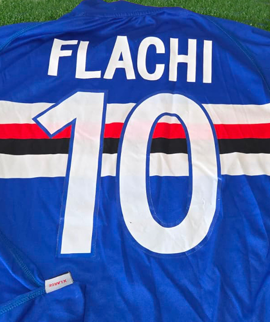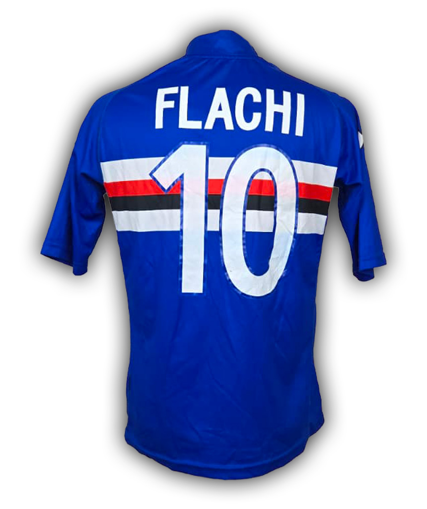 Maglia Home della Sampdoria stagione 2007/09 con personalizzazione Flachi 10, classico blu con fascia orizzontale biancorossonera.