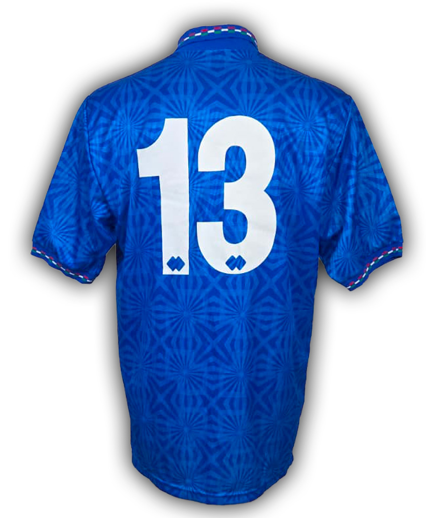 Maglia Home della Nazionale Italiana realizzata da Erreà, con iconico motivo geometrico azzurro e numero 13, in versione a manica lunga.