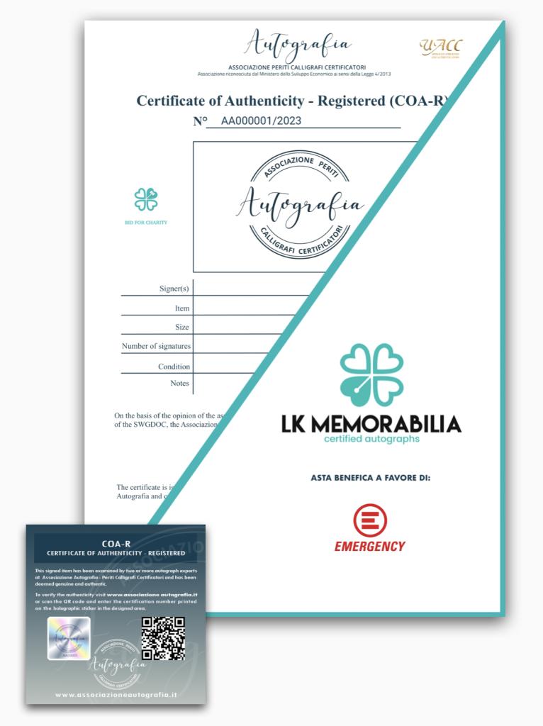 Tutti gli autografi in vendita sono supervisionati e certificati dai periti dell'Associazione Autografia - Periti Calligrafi Certificatori che ne garantiscono l'autenticità e genuinità. Il certificato di autenticità COA R non ha scadenza ed è valido in tutto il mondo.