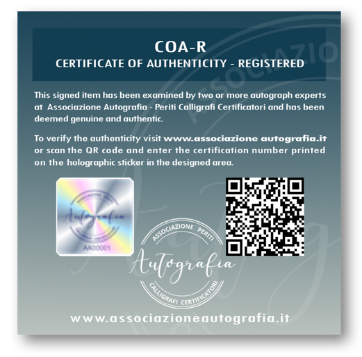 Tutti gli autografi in vendita sono supervisionati e certificati dai periti dell'Associazione Autografia - Periti Calligrafi Certificatori che ne garantiscono l'autenticità e genuinità. Il certificato di autenticità COA R non ha scadenza ed è valido in tutto il mondo.