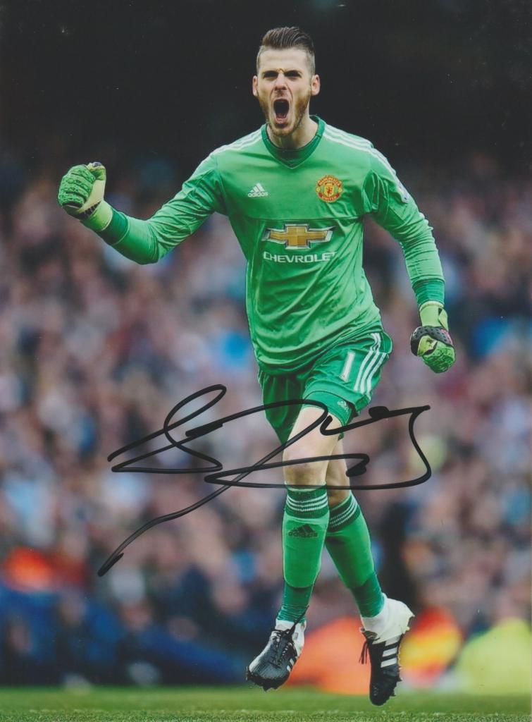 Autografo di David De Gea su fotografia a colori con la maglia del Manchester United David De Gea indossa la divisa da portiere del Manchester United con maglia verde prodotta da Adidas, stemma del club sul lato sinistro del petto e sponsor Chevrolet al centro; il completo è abbinato a pantaloncini coordinati e guanti da portiere.