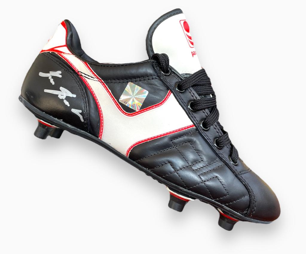 L'autografo è apposto sulla scarpa destra in pennarello argento.