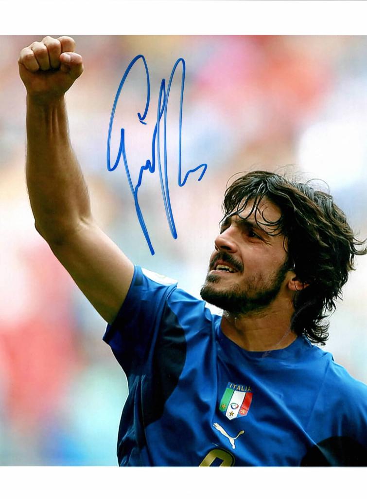 La foto ritrae Gattuso mentre esulta, con la maglia della Nazionale. La firma è posta al centro della foto, in alto.